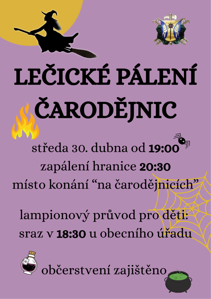Lečické pálení čarodějnic se koná ve středu 30. dubna od 19:00. V rámci akce se uskuteční lampionový průvod pro děti, sraz je v 18:30 u obecního úřadu. Hlavní událostí večera bude zapálení hranice, které proběhne ve 20:30. Těšíme se na vaši účast!