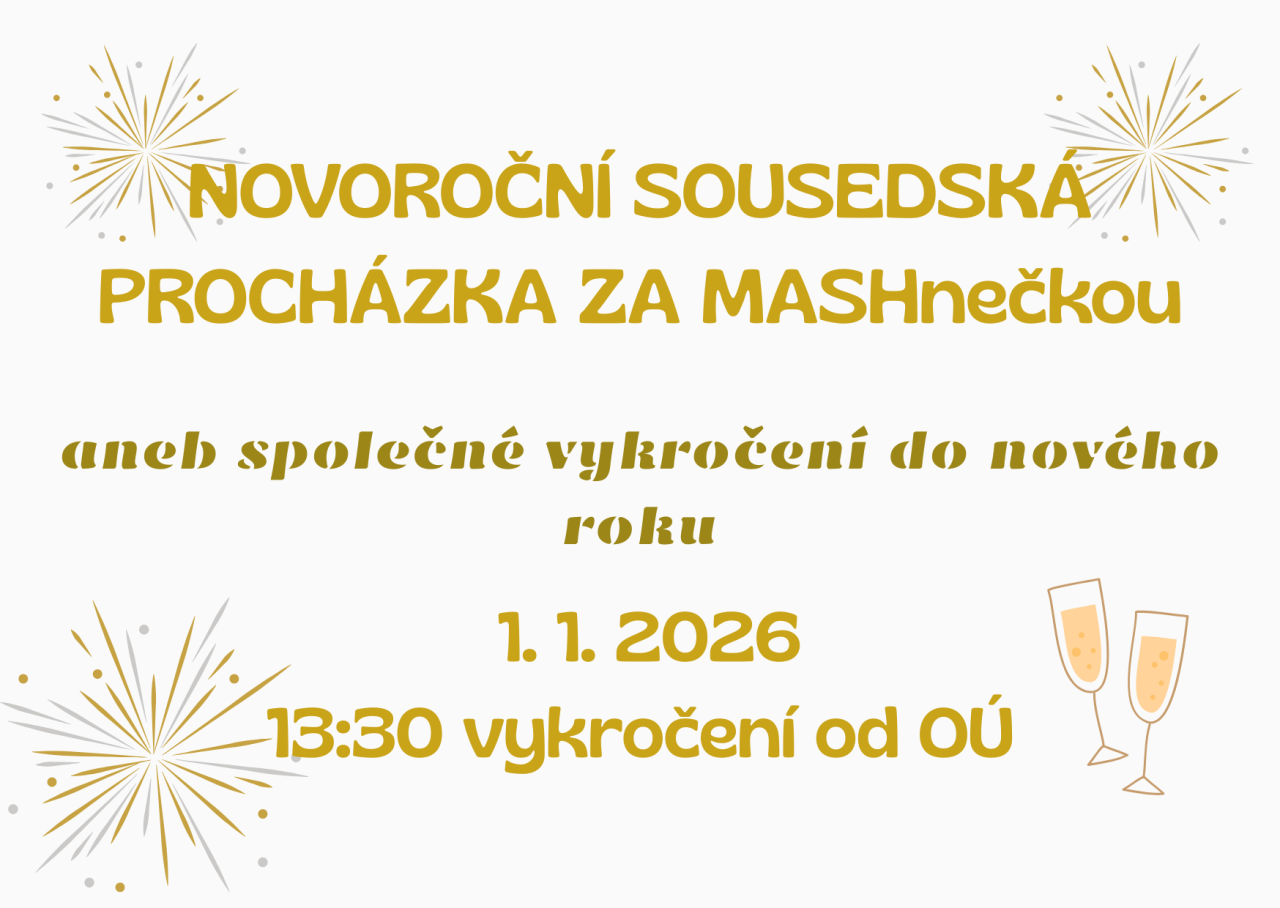Zveme všechny obyvatele na novoroční sousedskou procházku, která se koná 1. ledna 2026. Společně vykročíme do nového roku a užijeme si příjemné chvíle v přírodě. Sraz bude v 13:30 u Obecního úřadu. Přijďte se setkat se sousedy a oslavit nový rok hezkou procházkou.