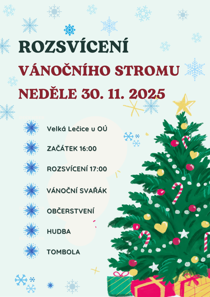Zveme vás na tradiční rozsvícení vánočního stromu, které se uskuteční v neděli 30. listopadu 2025 ve Velké Lečici u obecního úřadu. Akce začíná v 16:00, samotné rozsvícení proběhne v 17:00. Připravili jsme pro vás vánoční svařák, občerstvení a hudební program. Nezapomeňte se zúčastnit také tomboly.